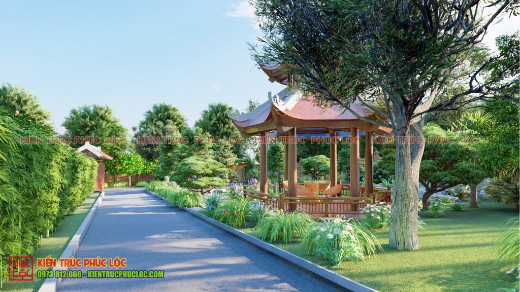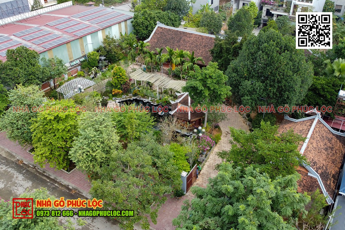 Tổng thể cảnh quan sân vườn nhà gỗ kẻ truyền
